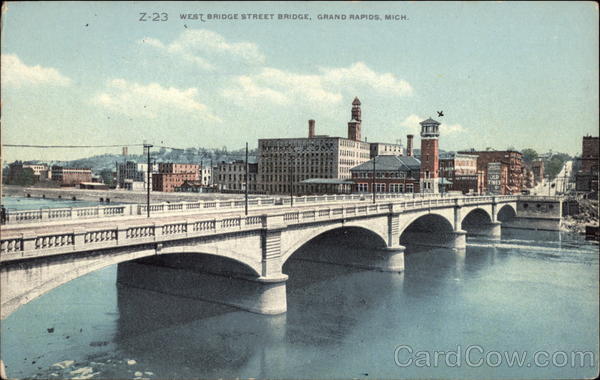 Front: Z-23 WEST BRIDGE STREET BRIDGE, GRAND RAPIDS, MICH. OLD TIMES 7404EA Back: 7,- Mrand Tzanele defret Building with red Towel Concrete biſte se haudeome structure