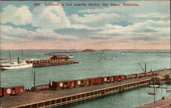 Front: 6333. Entrance to Los Angeles Harbor, San Pedro, California. Back: 10 POSSESSIONS. CANADA, MEXICO, FOREIGN 2ยข PUBLISHED BY CARDINELL-VINCENT CO., SAN FRANCISCO, LOS ANGELES..
