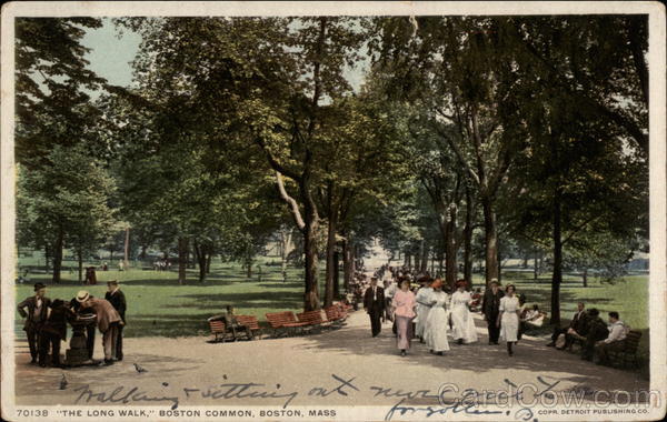 Front: na !! 70138 "THE LONG WALK," BOSTON COMMON, BOSTON, MASS COPR. DETROIT PUBLISHING CO. Back: FOREIGN, TWO 50 1212 MADE ONLY BY DETROIT PUBLISHING CO. TRADE MARK - REG. U. S. PAT. OFF. "PHOSTINT" CARD. THIS SPACE MAY BE USED FOR MESSAGE.