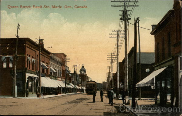 Front: Queen Street, Sault Ste. Marie. Ont., Canada ANS AN CIGA AD 105,309 (JV) Back: 4.00 FAMOUS BATTISH Courgondance MANUFACTUR The Valentine & Sons Publishing Com Montreal A gazda
