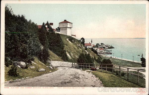 Front: COPYRIGHT FORT MACKINAC. BUILT IN 1780. 1899, BY DETROIT PHOTOGRAPHIC 5148. OLD FORT AND HARBOR, MACKINAC ISLAND. MICH. CO Back: FOREIGN. TWO MADE ONLY BY DETROIT PUBLISHING CO. "PHOSTINT"CARD. THIS SPACE MAY BE USED FOR MESSAGE.