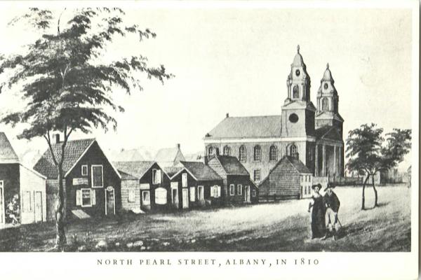 North Pearl Street, Albany, in 1810. No. 7, Albany Historic Post Card Series. Pearl Street north from present Sheridan Avenue, the James Eights' View of the North Dutch Church. This church, designed by the architect Philip Hooker, is still standing. A mile further to north stood the Van Rensselaer Manor House. |