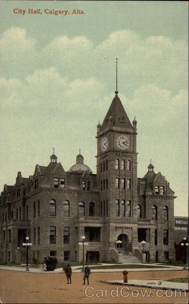 Front: City Hall, Calgary, Alta. Delicious Refreshinge 107822. Back: The Valentine & Sons Publishing Co., Ltd. Montreal and Toronto THROUGHOUT THE WORLD. SNOS FA FAMOUS .CARD MANUFACTURE BRITISH