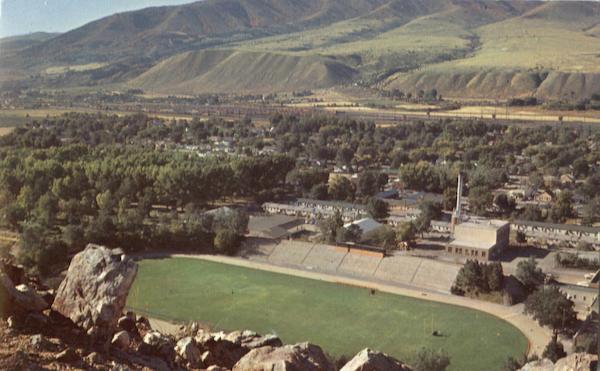 MOORE NEWS, INC. - 150 N. 2nd Ave. - Pocatello, Indiana POCATELLO, IDAHO View from famous "Red Hill" of campus and stadium of Idaho State College - Home of the "Bengals". P22729 by COLOURPICTURE PUBLISHERS, INC., Boston 30 Mass., U.S.A HERE