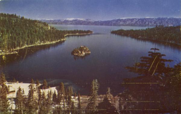 Cupped in the California-Nevada high Sierras is sapphire-blue Emerald Bay, formed by part of Lake Tahoe. The Indian name "Big Water" is well chosen as this is the largest body of water on the continent at this high elevation.