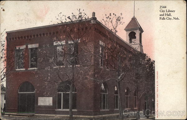 Front: But CAR WA iOS:MAL AR UFFERTER MANUFACTURED BY CURT TEICH & CO. CHICAGO 2544 City Library and Hall, Falls City, Neb. Back: CHICAGO NOTHING BUT THE ADDRESS ON THIS SIDE 1 PM 1900 Mor. H. 6. Waters RR 1.#40 St Johnn Kan