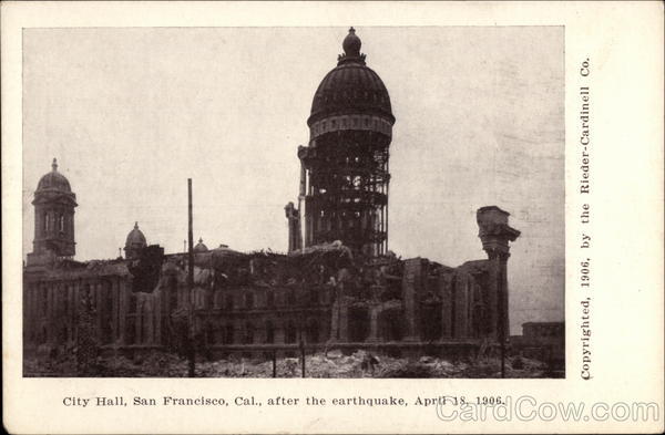 Front: City Hall, San Francisco, Cal., after the earthquake, April 18, 1906. Co. Copyrighted, 1906, by the Rieder-Cardinell Co. Back: SOUVENIR MC POST CARDS 適合 UNTER M. RIEDER, PUB.. LOS ANGELES, CAL. TWO CENTS