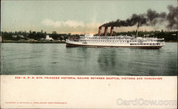 Front: 239-C. P. R. STR. PRINCESS VICTORIA, SAILING BETWEEN SEATTLE, VICTORIA AND VANCOUVER EDWARD H. MITCHELL. PUBLISHER, SAN FRANCISCO. Back: -Post Card- TWO CENTS