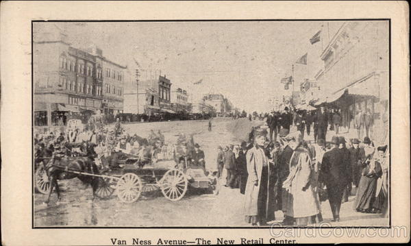Front: 14 AV Van Ness Avenue-The New Retail Center. FH Ther HA Back: COMPLIMENTS OF SAN FRANCISCO SUNDAY EXAMINER 1c. for United States and Canada; 2c. for abroad.