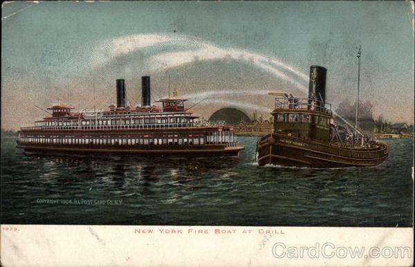 Front: 1929. *** HATAY COPYRIGHT 1904. ILL POST CARD GO. N.Y. THE NEW YORKER O NEW YORK FIRE BOAT AT DRILL THE NEW YORKER 0163 h Back: DOMESTIC AND Two CENTS