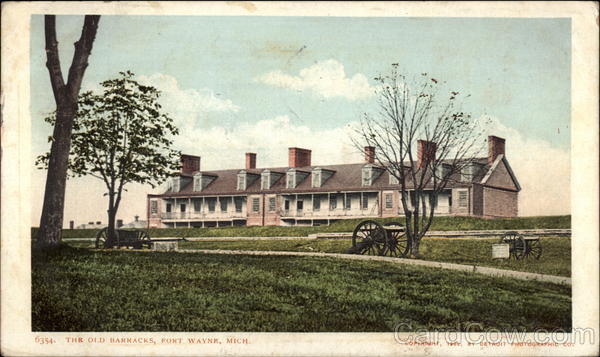Front: 6354- THE OLD BARRACKS, FORT WAYNE, MICH. COPYRIGHT, 1902, BY DETROIT PHOTOGRAPHIC CO. Back: 2800 REEN ENOR UNITED STATES OF 2800 AC FG 23 11 1706 FRANKLIN 1790 905 Miss Ella Kettrich 12 Zemon 16. Baffale BUFFA Tad TRE NY