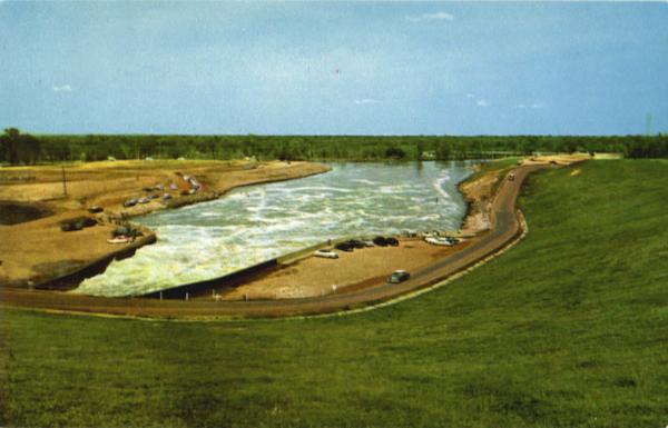 DISTRIBUTED BY HALE PARKER, TEXARKANA, U. S. A. THE FLOOD GATES AT LAKE TEXARKANA TEXARKANA, TEXAS AS SEEN FROM THE DAM CURTEICHCOLOR 3-D NATURAL COLOR REPRODUCTION (REG. U. S. A. PAT. OFF.) BC-K1190 HERE