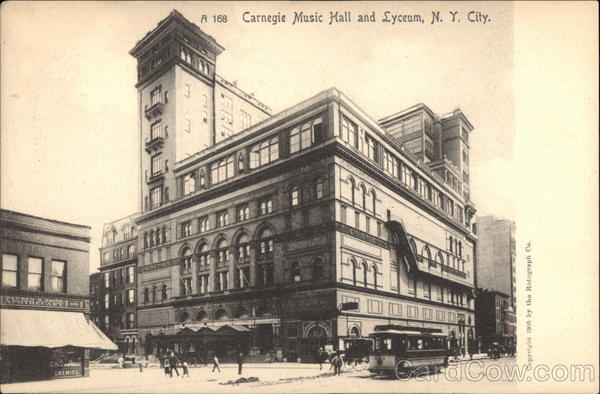 Front: REURE APOTHECARY. 901 CHEMIST ff 77 A 168 Carnegie Music Hall and Lyceum, N. Y. City. Copyright 1905 by the Rotograph Co. Back: The Rotograph Co., N. Y., City. (Germany.) Two cents