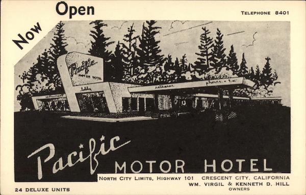 Now Open Prad TELEPHONE 8401 MOTOR HOTEL NORTH CITY LIMITS, HIGHWAY 101 24 DELUXE UNITS OR **** belly Pacific CRESCENT CITY, CALIFORNIA WM. VIRGIL & KENNETH D. HILL OWNERS