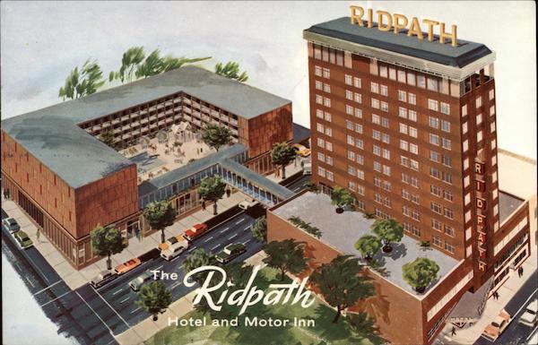 | The finest facilities of the metropolitan hotel and the modern motel combined for your enjoyment in the heart of the city. Cabanas, sun deck, swim pool, three restaurants including the famed Ridpath Roof. Choise of 375 lanai or tower rooms. Completely air conditioned. Ample free parking and free television |