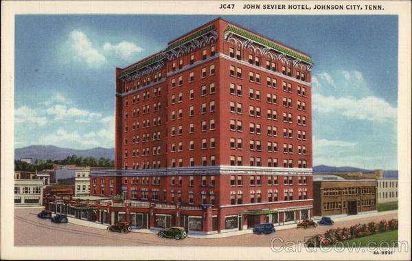 Front: JC47 JOHN SEVIER HOTEL, JOHNSON CITY, TENN. 4A-H991 Back: C. T. ART-COLORTONE Rothing 18 Agut 1988