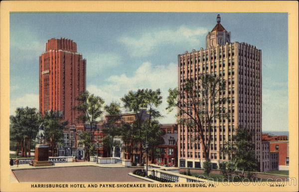 Front: COUM ER 3A-H 914 HARRISBURGER HOTEL AND PAYNE-SHOEMAKER BUILDING, HARRISBURG, PA. Back: DISTRIBUTED BY J. B. HOFFMAN & SON, HARRISBURG, PA. Pay Shower to 1987