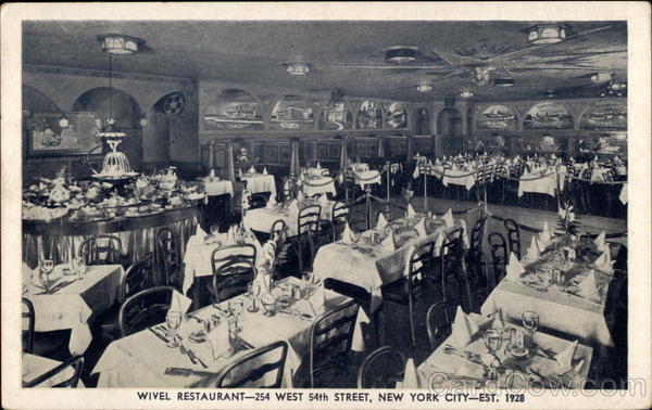 Front: WIVEL RESTAURANT-254 WEST 54th STREET, NEW YORK CITY-EST. 1928 Back: Visit the WIVEL RESTAURANT FAMOUS FOR SMORGASBORD Dinner and Supper Dancing Revue-3 Shows Nightly Phone Circle 7-9800 AIR-CONDITIONED 1,25 MADE IN USA le ENGLER