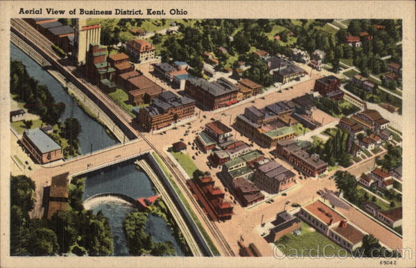 Front: Aerial View of Business District, Kent. Ohio 65042 Back: نکر "TICHNOR QUALITY VIEWS" REG. U. S. PAT. OFF. MADE ONLY BY TICHNOR BROS., INC., BOSTON, MASS. PUBLISHED BY CAMPUS SUPPLY STORE, KENT, OHIO