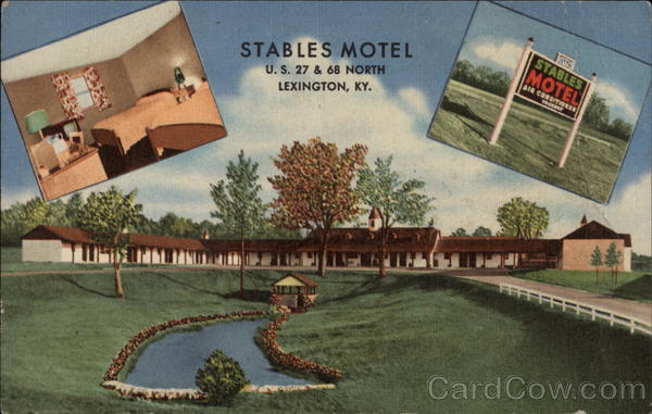 | U. S. 27 & 68 NORTH STABLES MOTEL 1700 N. BROADWAY - LEXINGTON, KY. Phone: 4-6828 50 Units; 50 private baths; Central Heating and Air-conditioning, Television & Telephone; Wall-to-wall carpeting; Restaurant one block; Beautyrest Mattresses; QUIET--300 feet from highway |
