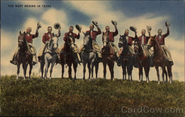 Front: THE WEST BEGINS IN TEXAS Back: 15201 A COLOURPICTURE'' PUBLICATION, CAMBRIDGE, MASS., U. S. A. PHOTO BY ROY CHRISTIAN OKLAHOMA CITY CHAMBER OF COMMERCE