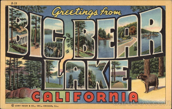 Front: В-19 Greetings from he an AKE CALIFORNIA ©CURT TEICH & CO., INC., CHICAGO, ILL. Back: 8A-H2852 “C.T. ART-COLORTONE''-DISTRIBUTED BY FRASHER'S, INC., POMONA, CALIF. Shashas FOTOS