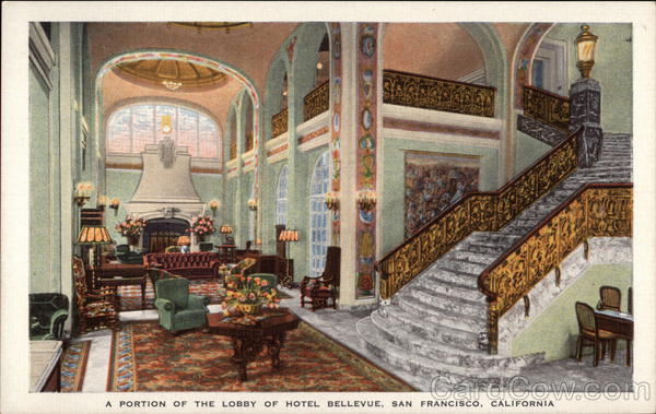 Front: www. A PORTION OF THE LOBBY OF HOTEL BELLEVUE, SAN FRANCISCO, CALIFORNIA Back: 8486 N Hotel Bellevue GEARY AT TAYLOR ST. WASHINGTON IRVING LETTER x PAPERS RECO MADE IN U.S.A. BY E. C., KROPP CO., MILWAUKEE, WIS. H. F. GOULD 166 GEARY STREET