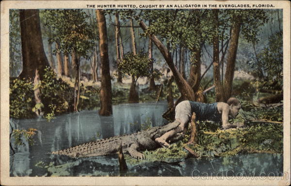 Front: THE HUNTER HUNTED, CAUGHT BY AN ALLIGATOR IN THE EVERGLADES, FLORIDA. Back: A-31377 THIS SPACE FOR ADDRESS ONLY.