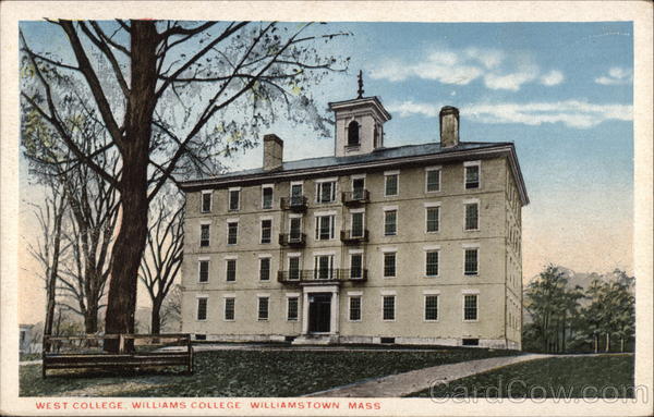 Front: WEST COLLEGE. WILLIAMS COLLEGE WILLIAMSTOWN MASS menye Back: Pub. by W. J. Muldowney, Williamstown, Mass. TWO CENTS