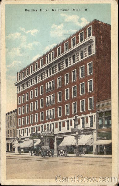 Front: 17 hann m OL 70000 ГЛАВНАЕЛЕНННЕ, 00000 0000 000000 000 00000 70000 ATAT FAC 00 Burdick Hotel, Kalamazoo, Mich.-9 HTT NEW HOTEL BURDICK PLO O Back: E. C. KROPP CO., MILWAUKEE 18056 Co