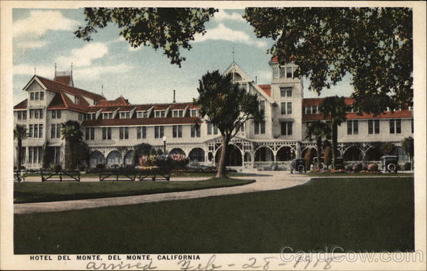 Front: TOI HOTEL DEL MONTE, DEL MONTE, CALIFORNIA arrived ORNMAh - 28-1918 SORENS Back: 1918 Feb-2 To Med - to March 4 Mon- day. 52768 COMMERCIALCHROME rd ar STAMP HERE