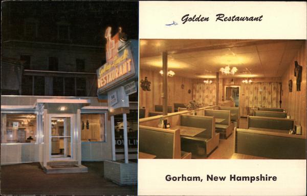 | The Year Around Vacation Town AIR CONDITIONED GOLDEN RESTAURANT 94 Main Street, Gorham, New Hampshire U.S. Route 2 and 16 - Specializing in Sea Foods - Full Course Dinners - A La Carte Service - Restaurant Liquor License - Mr. and Mrs. Arthur Richer, Proprietors |