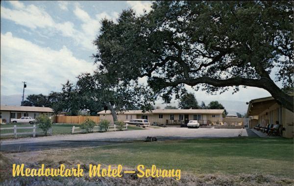 | MEADOWLARK MOTEL 2644 Mission Drive Solvang, California 93463 Relax in a modern, rurar motel overlooking the beautiful Santa Ynez Valley. Just 1 1/2 miles east from Solvang. Quiet, Air Conditioned Rooms - Heated Pool - Television - Courtesy Coffee. Color Photo by Bob Rodgers |