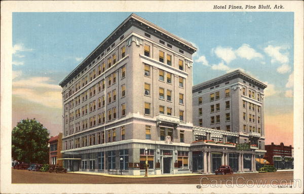 Front: Hotel Pines, Pine Bluff, Ark. BEF EF FE FRIEE 8638 PINES ANE 5A111-N Back: BURNHAM NEWS AGENCY, PINE BLUFF, ARK, GENUINE CURTEICH.CHICAGO **C.T. AMERICAN ART":