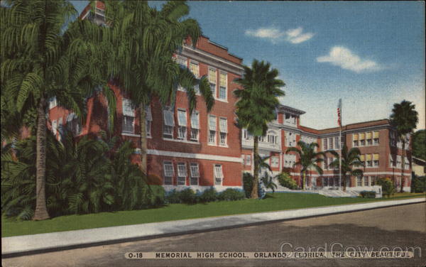 Front: 0-18 MEMORIAL HIGH SCHOOL, ORLANDO, FLORIDA, THE CITY BEAUTIFUL Back: E.7669 PUBLISHED BY HARTMAN LITHO SALES CO., BOX 697, LARGO, FLORIDA Photo by T. P. Robinson, Orlando, Florida