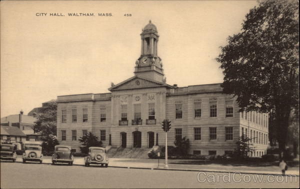 Front: CITY HALL, WALTHAM. MASS. 458 ELUE 41920 Back: 500 BOSTON, Mass ato GELATINE Tas SPACE FOR ADDRESS