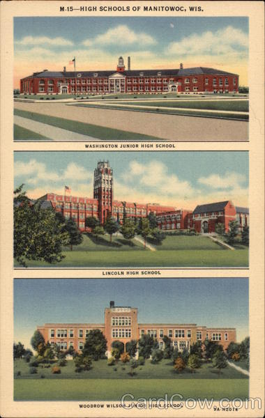 Front: M-15-HIGH SCHOOLS OF MANITOWOC, WIS. WASHINGTON JUNIOR HIGH SCHOOL LINCOLN HIGH SCHOOL WOODROW WILSON JUNIOR HIGH SCHOOL 9 A-H2014 EI 13 Back: MANITOWOC CIRCULATORS, MANITOWOC, WIS. 5. 1217