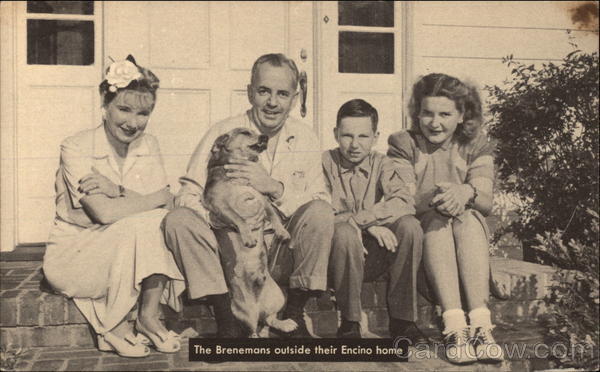 Front: The Brenemans outside their Encino home Back: Listen to Tom Breneman's Breakfast in Hollywood Monday through Friday Over the American Broadcasting Company CO PR. 1945 BY KELLOGG CO.