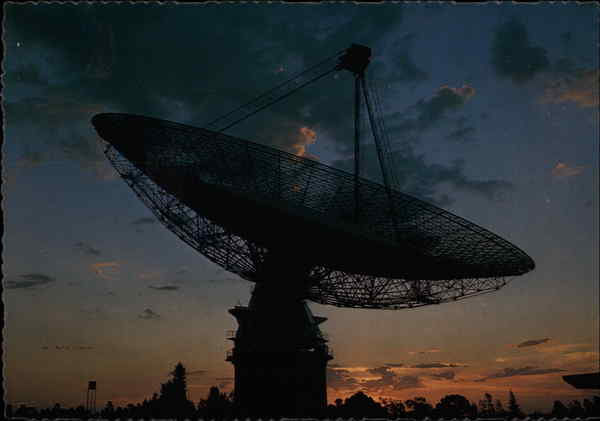 Produced by MURRAY VIEWS, Gympie, Q., AUSTRALIA FROM AN ORIGINAL EKTACHROME TRANSPARENCY COPYRIGHT PARKES, N.S.W. Radio Telescope at sunset. AUSTRALIAN MADE W12 Stamp