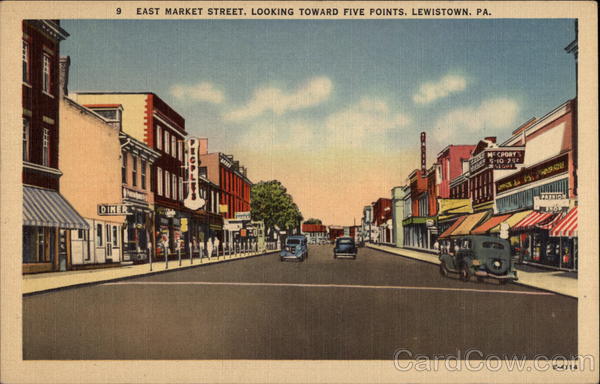 Front: EAST MARKET STREET, LOOKING TOWARD FIVE POINTS, LEWISTOWN. PA. MC CRORY'S 5-10 25 DINER E-4114 Back: E. MADCIFF, HERSHEY, PA.