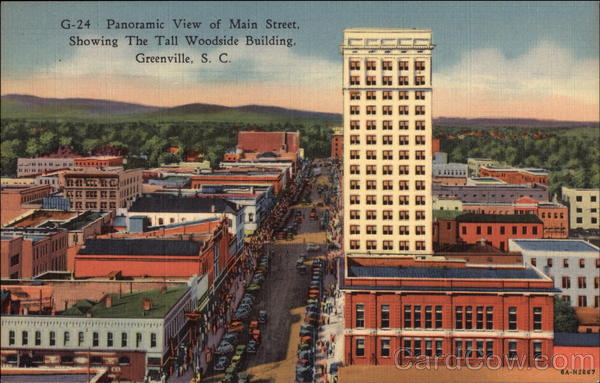 Front: G-24 Panoramic View of Main Street, Showing The Tall Woodside Building, Greenville, S. C. CO. 6A-H2667 Pod Back: “C.T. ART-COLORTONE” REG.U.S. PAT. OFF.