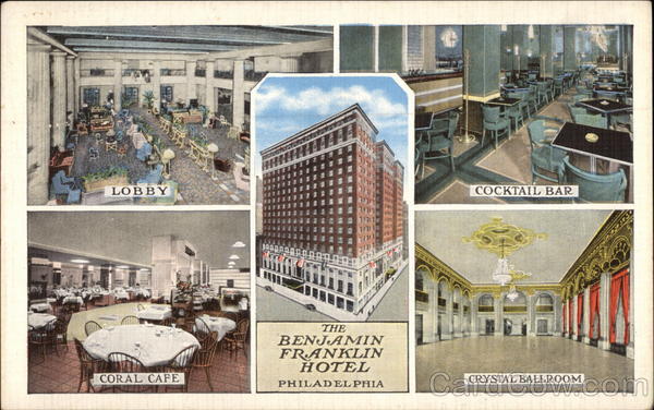 | Philadelphia's foremost Hotel as well as the largest and most modern and ideally located, close to shops, theatres and historic shrines. 1200 luxurious outside rooms with baths. Two beautifully appointed restaurants offering finest food a la carte and table d'hote. Moderate Prices Prevail |