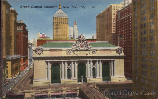 | Located on East 42nd Street between Vanderbilt and Lexington Avenues, this is the terminus of the New York Central, the New York, New Haven and Hartford and the New York and Harlem Railroads. Over 500 trains arrive and depart daily in this largest railway terminal of the world |