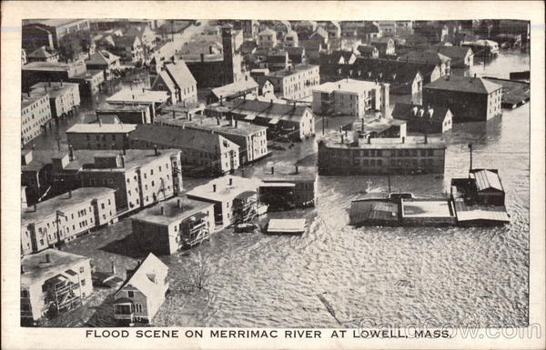 Front: 11 FLOOD SCENE ON MERRIMAC RIVER AT LOWELL, MASS. Back: PRINTED BY TICHNOR BROS. CO NO. WASH. ST., BOS ASS.