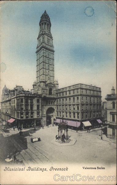 Front: BORAN Municival Buildings, Greenock TRI Valentines Series Back: e here for Inland Postage only. 1230PM Miſs Mary M- Bongace GR REVENUE 55 Woodward Avenues Rochestener. 7. America. مجھ