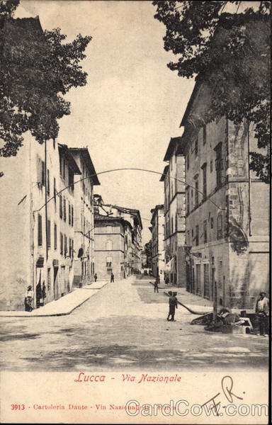 Front: Lucca Via Nazionale 3913 Cartoleria Dante Via Nazionale 12 Lucca. F.R. Back: ORK.N. CARTOLINA POSTALE ITALIANA CARTE POSTALE D'ITALIE 7905 24 Mrs Roosevelt 573 Fifth Avenue, M. S. America FOSFEITALIANE New York City BLOOKE O