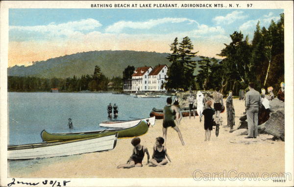 Front: BATHING BEACH AT LAKE PLEASANT, ADIRONDACK MTS., N. Y. 97 106925 Back: PUBLISHED BY C. W. HUGHES & CO., INC., MECHANICVILLE, N. Y. C, T. AMERICAN ART COLORED STAR QUALITY CHUS