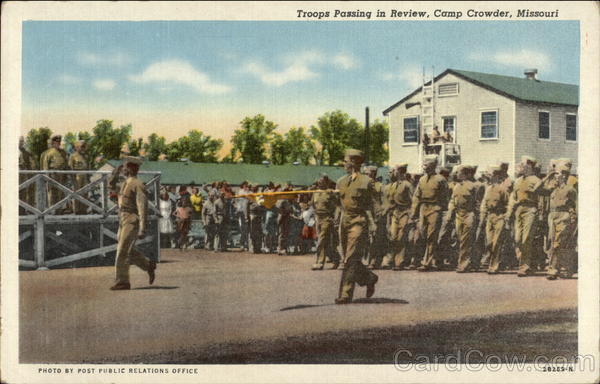 Front: Troops Passing in Review, Camp Crowder, Missouri PHOTO BY POST PUBLIC RELATIONS OFFICE 2B269-N Back: ADAMS NEWS CO., JOPLIN, MO.