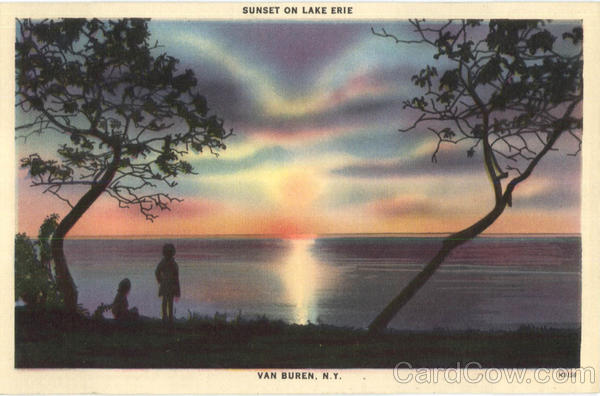Front: SUNSET ON LAKE ERIE VAN BUREN, N.Y. K9156 Back: 1.00 Sold by McClenathan Printery, Inc., Dunkirk, New York A "COLOURPICTURE PUBLICATION, BOSTON 15, MASS, U.S.A.