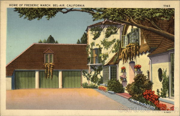 Front: HOME OF FREDERIC MARCH. BEL-AIR, CALIFORNIA T193 63803 Back: ONE CENT... MADE IN US tichrior art company, L. A.